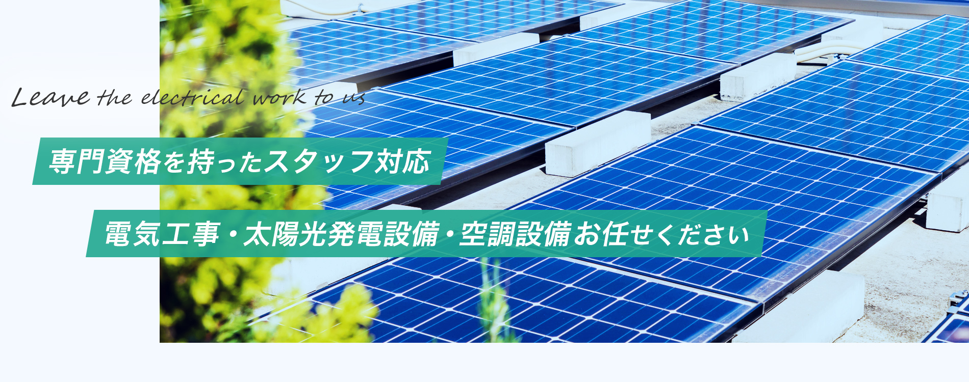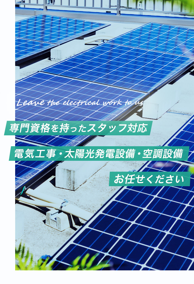 弊社では、太陽光発電設備から空調設備工事まで、電気工事全般にご対応しております。新たに太陽光発電設備をご検討中、空調設備を導入したい、などございましたら、お気軽にご相談ください。専門資格を持つスタッフが、お客様のご要望に合わせて、ご提案をさせていただきます。